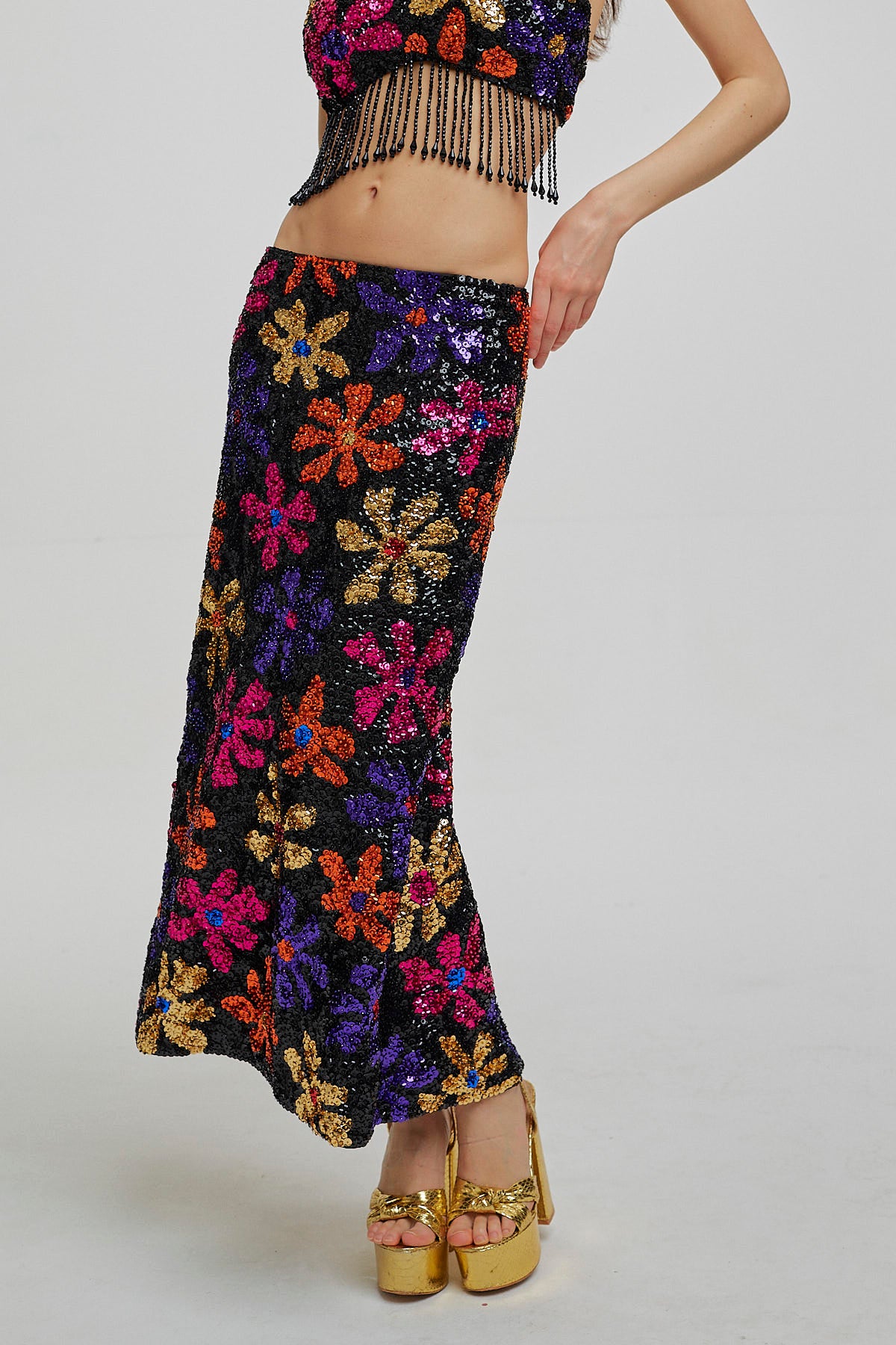 Easy Tiger's hand embroidered Fleur Skirt features a low waist, maxi a-line shape and metallic 70s-inspired sequin floral motifs.